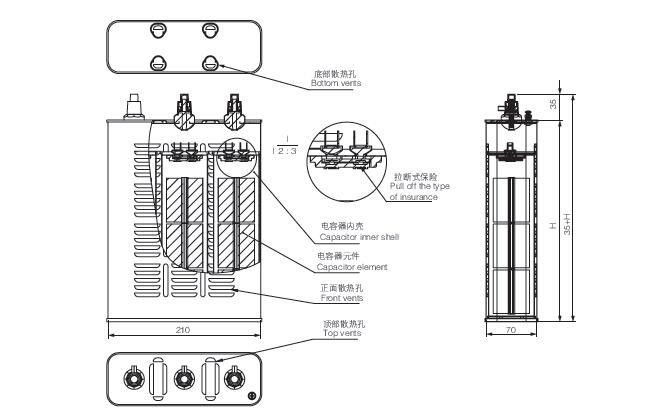 ¤Adapt to the altitude of 2000~5000 meters in the plateau area. ¤Three characteristics of anti - low pressure, low temperature and temperature resistance. ¤Excellent heat dissipation function: internal use of multiple sets of cylindrical capacitor combined structure, the heat dispersion polymerization; capacitor shell side adopts a multi row louvered vents, top and bottom cover with a convection hole design, circulation cooling. ¤Cylindrical capacitance unique bakelite terminal, copper plate open type tensile explosion-proof device (patent:ZL 2013 1 0370567.3 ,ZL 2013 1 02449000.6), effectively reduce the calorific value of the terminal, the explosion-proof function is reliable. ¤Cylindrical capacitor using double sealing treatment, anti low pressure, low temperature function, to prevent leakage of shell deformation. ¤The insulation strength is increased and the temperature of the shell is reduced by adopting the anti radiation insulation paint capacitor shell. ¤Plateau dry type capacitor broke through the traditional oil, wax capacitor, due to the temperature of the defects, to ensure the reliability and safety of plateau dry capacitor.